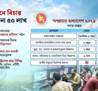 রাষ্ট্রের নিরাপত্তা বিঘ্নিত হয় এমন তথ্য প্রচার এবং অনুমোদনহীন বিজ্ঞাপন নিয়ন্ত্রণে কঠোর হচ্ছে সরকার। এ লক্ষ্যে জেল-জরিমানার বিধান রেখে ‘সম্প্রচার অধ্যাদেশ, ২০২৬’-এর খসড়া প্রস্তুত করেছে তথ্য ও সম্প্রচার মন্ত্রণালয়। প্রস্তাবিত এই আইনে জননিরাপত্তা রক্ষায় সামরিক-বেসামরিক গোপন তথ্য ফাঁস এবং জুয়া বা প্রতারণামূলক বিজ্ঞাপন প্রচারের ক্ষেত্রে কড়া শাস্তির প্রস্তাব করা হয়েছে। তথ্য ও সম্প্রচার মন্ত্রণালয় থেকে […]