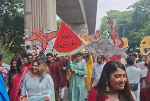 রাজধানীতে উৎসবমুখর পরিবেশে অনুষ্ঠিত বৈশাখী শোভাযাত্রা সমাপ্ত হয়েছে। মঙ্গলবার (১৪ এপ্রিল) সকাল ১০টার দিকে শোভাযাত্রাটি ঢাকা বিশ্ববিদ্যালয়ের চারুকলায় এসে শেষ হয়। এতে কয়েক হাজার মানুষ অংশ নেন। বরাবরের মতো এবারও শোভাযাত্রায় বিশ্ব ও দেশীয় ইস্যুর প্রতিফলন দেখা গেছে। এরমধ্যে ‘ফ্রি প্যালেস্টাইন’ লেখা প্ল্যাকার্ড নজর কেড়েছে সবার। চারুকলা-টিএসসি ঘুরে দেখা গেছে, শোভাযাত্রায় অংশগ্রহণকারীদের হাতে ছিল বিভিন্ন […]