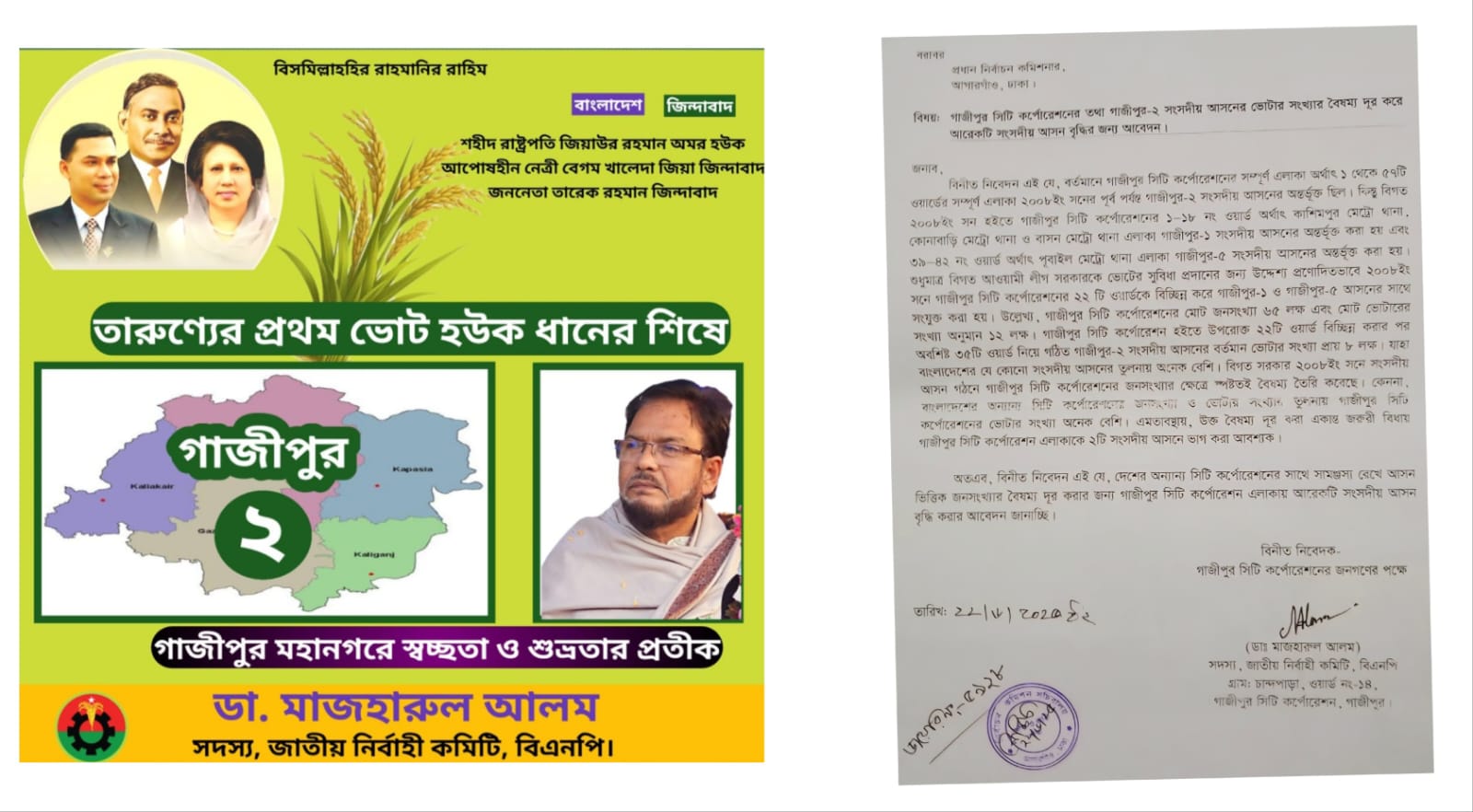 গাজীপুর: বিএনপির কেন্দ্রিয় নির্বাহী কমিটির অন্যতম সদস্য, বিশিষ্ঠ লেখক ও গবেষক ডা: মাজহারুল আলমের আবেদনের ভিত্তিতে গাজীপুর-২ আসনের নতুন সীমানা নির্ধারিত হয়েছে। গত ২২ জুন ২০২৫ তারিখে প্রধান নির্বাচন কমিশনারের সঙ্গে সাক্ষাত করে তিনি লিখতভাবে এই আবেদন করেন, যাহার ডাইরী নম্বর ৫৯২৮ তাং ২২.০৬.২৫। তার আবেদন বিবেচনা করে নির্বাচন কমিশন এই সিদ্ধান্ত দিয়েছেন বলে দাবী করেছেন তিনি। ৩০ জুলাই নির্বাচন কমিশন গাজীপুরে একটি আসন বাড়িয়ে মোট ৬টি আসনের সীমানা নির্ধারণ করে খসড়া প্রকাশ করে। এই খসড়ায় গাজীপুর-১ আসন থেকে বাসন, চান্দনা চৌরাস্তা সহ বেশ কিছু এলাকা কেটে গাজীপুর-২ আসনে অন্তর্ভূক্ত করা হয়। এই অন্তর্ভূক্তির আবদেনই করেছিলেন ডা: মাজহারুল আলম। ডা: মাজহারুল আলমের আবেদনের ভিত্তিতে গাজীপুর-২ আসনের নতুন সীমানার খসড়া প্রকাশ হওয়ায় বাসন এলাকা সহ প্রায় অনেক জায়গায় মিষ্টি বিতরণ করা হয়েছে। সকলে ডা: মাজহারকে ধন্যবাদ ও কৃতজ্ঞতা জানিয়েছেন। তারা আগামী নির্বাচনে গাজীপুর-২ আসনে ডা: মাজহারুল আলমকে ধানের শীষ উপহার দেয়ার জন্য বিএনপির প্রতি দাবী জানান।