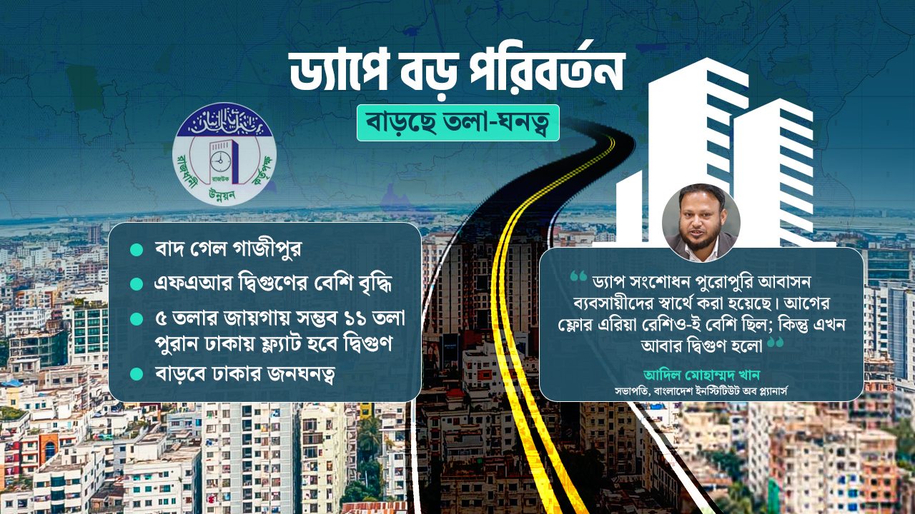 ড্যাপের এই নতুন সংশোধনীর ফলে এখন রাজউক এলাকার প্রায় সব জায়গাতেই ভবনের উচ্চতা বাড়ছে। সংশোধিত ড্যাপ এবং ‘খসড়া ঢাকা মহানগর ইমারত বিধিমালা– ২০২৫’ অনুযায়ী— বহু এলাকায় ফ্লোর এরিয়া রেশিও (এফএআর) দ্বিগুণেরও বেশি বাড়ানো হয়েছে। ফলে আগে যেখানে সর্বোচ্চ পাঁচতলা ভবন নির্মাণের সুযোগ ছিল, এখন সেখানে ১০ থেকে ১১ তলা পর্যন্ত ভবন নির্মাণ করা যাবে।