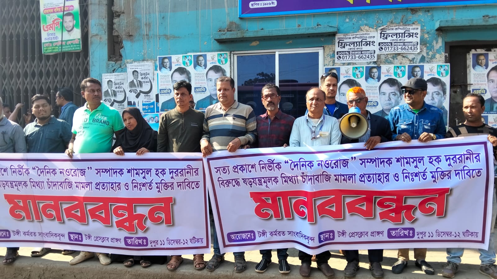 গাজীপুর: “দৈনিক নওরোজ” পত্রিকার সম্পাদক শামসুল হক দুররানীর বিরুদ্ধে দায়ের হওয়া তথাকথিত ষড়যন্ত্রমূলক ও মিথ্যা চাঁদাবাজি মামলা প্রত্যাহার এবং তাঁর নিঃশর্ত মুক্তির দাবিতে টঙ্গীতে মানববন্ধন অনুষ্ঠিত হয়েছে।