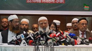এর আগে জামায়াতের সহকারী সেক্রেটারি জেনারেল ও ১১ দলের সমন্বয়ক হামিদুর রহমান আযাদের সঞ্চালনায় বাংলাদেশ খেলাফত মজলিসের আমির মাওলানা মামুনুল হকের প্রাথমিক বক্তব্যে সংবাদ সম্মেলন শুরু হয়।