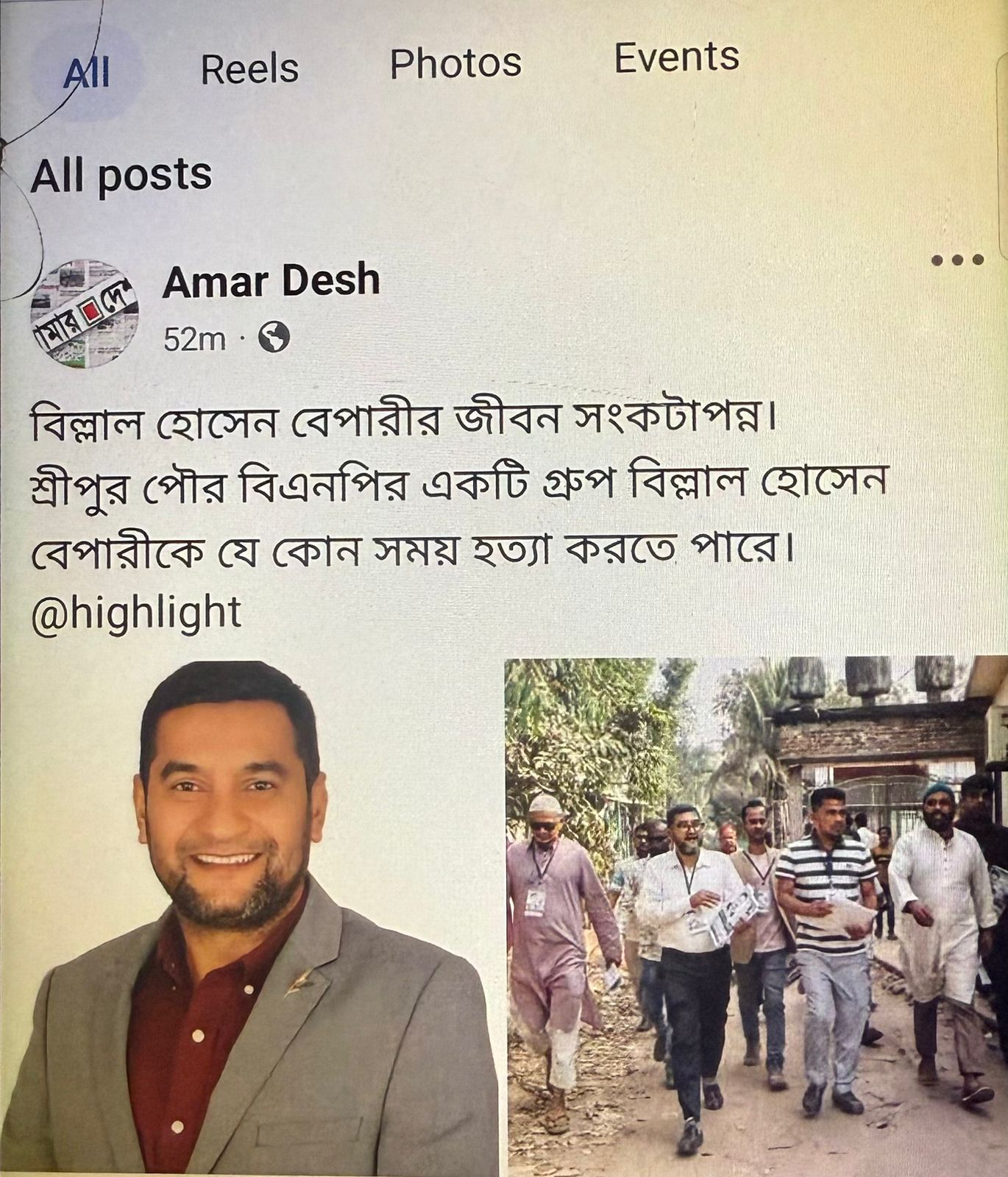 এই মর্মে জানাইতেছি যে, গত ২৯-০১-২০২৬ইং তারিখ বেলা অনুমান ১১টার সময় আমার ফেসবুক আইডিতে প্রবেশ করিয়া দেখতে পাই যে, “Amar Desh” নামের ফেসবুক আইডিতে আমার ছবি ব্যবহার করিয়া উহাতে “বিল্লাল হোসেন বেপারীর জীবন সংকটাপন্ন। শ্রীপুর পৌর বিএনপির একটি গ্রুপ বিল্লাল হোসেন বেপারীকে যে কোন সময় হত্যা করতে পারে। @highlight” লিখিয়া পোষ্ট করে। যাহার লিংক- https://www.facebook.com/share/174SbULCPr/। ইহাতে আমার আশংকা হইতেছে যে, অজ্ঞাত নামা ব্যক্তি উক্ত আইডির দ্বারা আমার নামে সমাজ বা রাষ্ট্রবিরোধী কথা বার্তা লিখিয়া পোষ্ট করিয়া বিএনপির মনোনিত প্রার্থী গাজীপুর-৩ আসনের সংসদ সদস্য প্রার্থী এস.এম. রফিকুল ইসলাম সাহেবের নির্বাচনী প্রচারনাকে বাধা গ্রস্থ করার জন্য এবং আমার জীবন নাশের আশংকা করিতেছি। এমতাবস্থায়, উপরোক্ত বিষয়টি ভবিষ্যতের জন্য সাধারন ডাইরীভূক্ত করিয়া রাখা একান্ত প্রয়োজন।