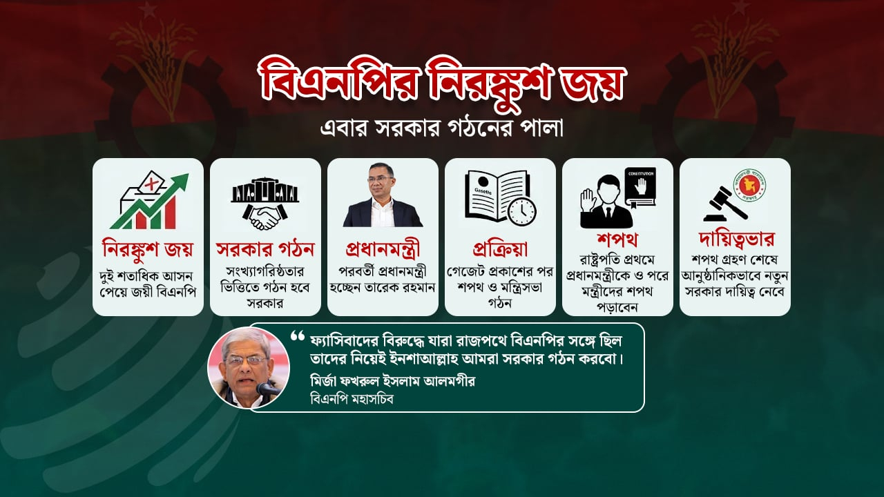 সংবিধান অনুযায়ী, কোনো দল বা জোট কমপক্ষে ১৫১টি আসন পেলে নিরঙ্কুশ সংখ্যাগরিষ্ঠতা অর্জিত হয়। সাধারণত সংখ্যাগরিষ্ঠ দলের প্রধানকেই রাষ্ট্রপতি সরকার গঠনের আহ্বান জানান। সেই হিসেবে বিএনপির চেয়ারম্যান তারেক রহমানই সরকার গঠন করবেন।