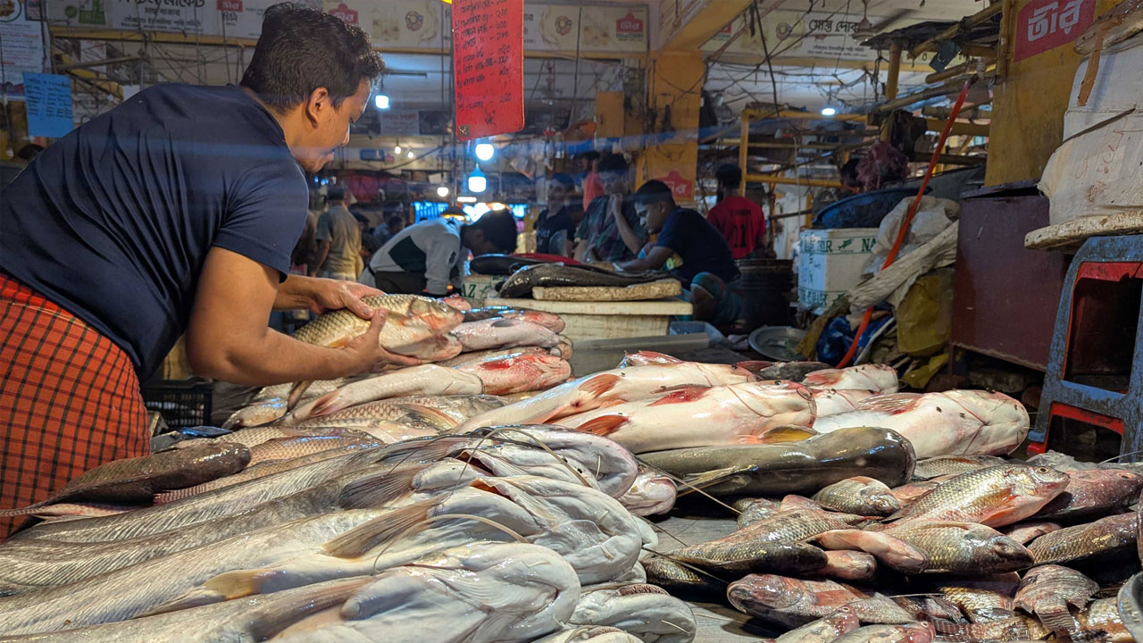 মাছের বাজারেও স্বস্তি নেই। মাঝারি আকারের রুই ৩৫০ থেকে ৪২০ টাকা কেজি, কাতলা ৩৮০ থেকে ৪৫০ টাকা, পাঙ্গাস ২০০ থেকে ২২০ টাকা এবং তেলাপিয়া ২২০ থেকে ২৫০ টাকায় বিক্রি হচ্ছে। ইলিশের দাম আকারভেদে ১ হাজার ২০০ থেকে ২ হাজার ৫০০ টাকার মধ্যে। এছাড়া শিং ৫০০ থেকে ৬০০ টাকা, মাগুর ৫৫০ থেকে ৬৫০ টাকা এবং চিংড়ি ৮০০ থেকে ১২০০ টাকা কেজি দরে বিক্রি হচ্ছে। কয়েকজন বিক্রেতা জানান, ভালো মানের দেশি মাছের সরবরাহ কম থাকায় দাম কিছুটা চড়া।