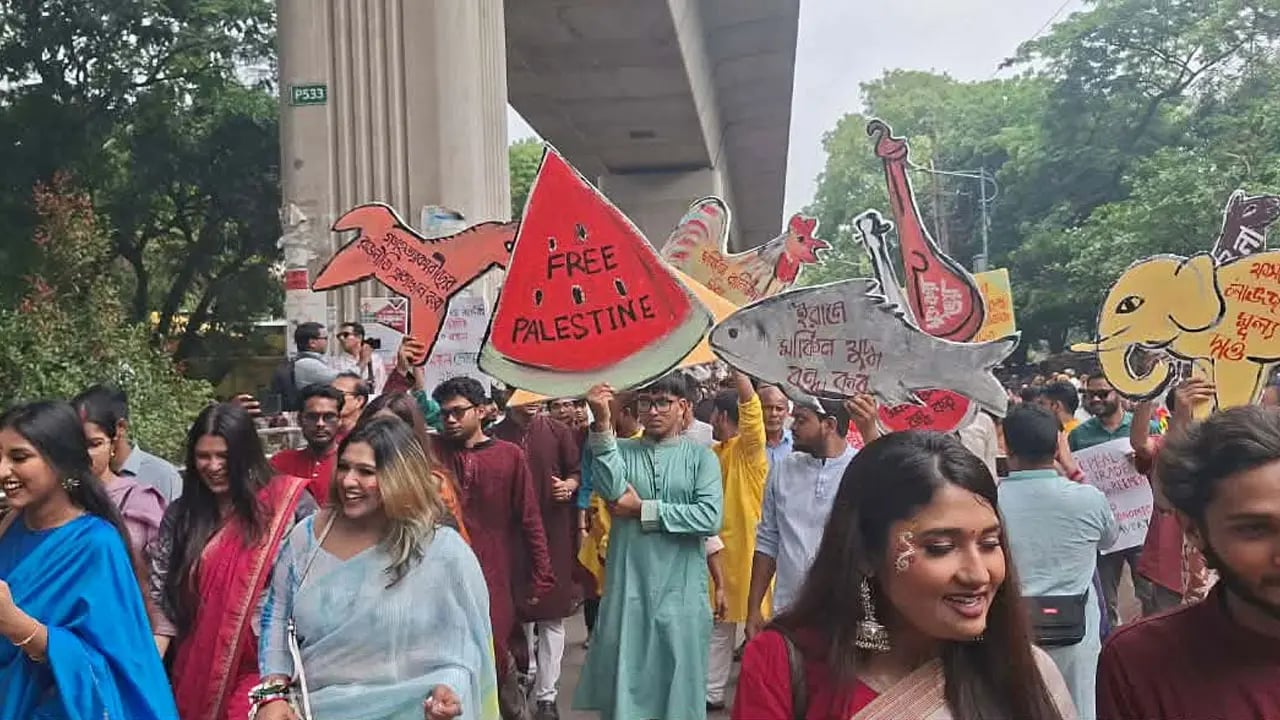 বরাবরের মতো এবারও শোভাযাত্রায় বিশ্ব ও দেশীয় ইস্যুর প্রতিফলন দেখা গেছে। এরমধ্যে ‘ফ্রি প্যালেস্টাইন’ লেখা প্ল্যাকার্ড নজর কেড়েছে সবার।