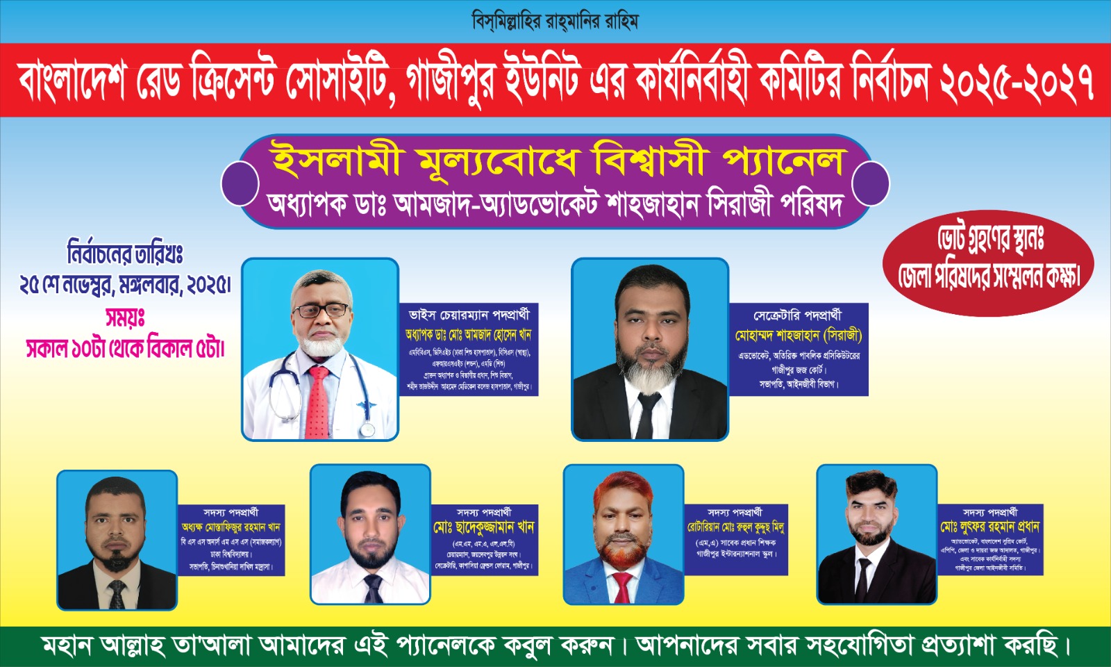 গাজীপুর: বাংলাদেশ রেড ক্রিসেন্ট সোসাইটি গাজীপুর ইউনিটের কার্যনির্বাহী কমিটির নির্বাচনে( ২০২৫-২০২৭) অধ্যাপক ডাঃ মোঃ আমজাদ হোসেন খান – অ্যাডভোকেট শাজাহান সিরাজী পরিষদের পরিচিতি।